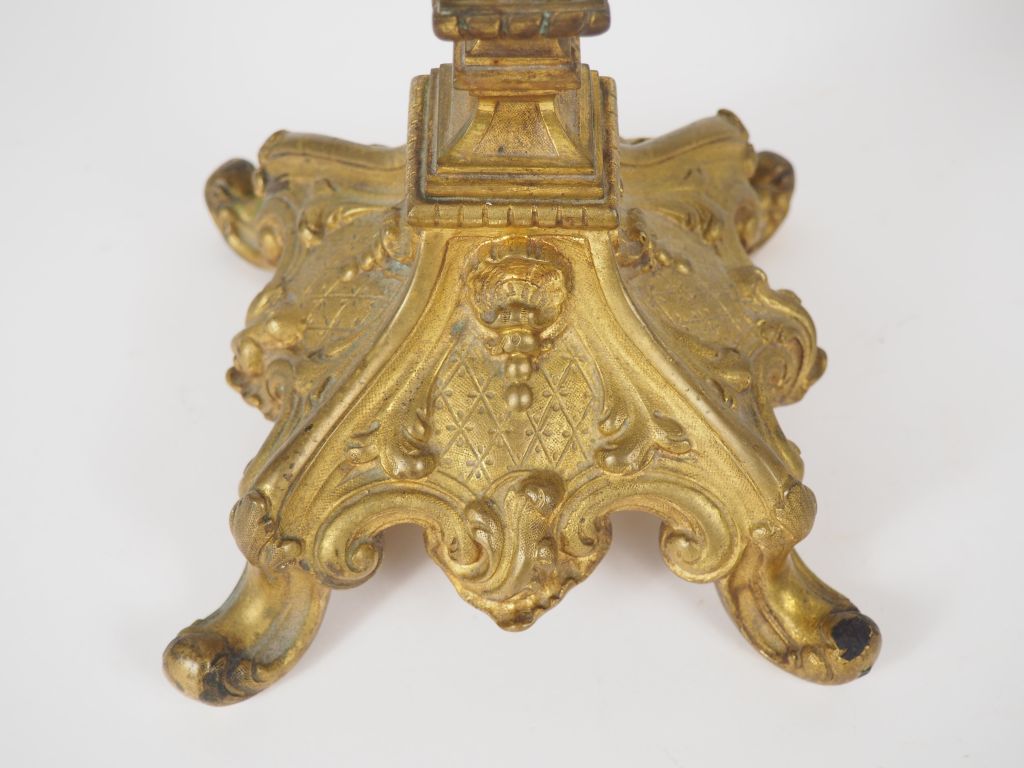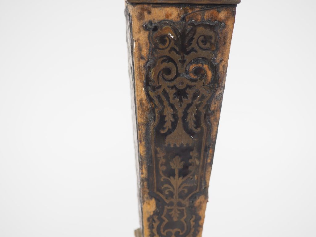 Paire de candélabres Napoléon III de style Louis XIV en bronze et marqueterie Boulle à décor de croisillons, de coquilles et de rinceaux feuillagés, éclairant à 5 lumières. H. 69 cm.
