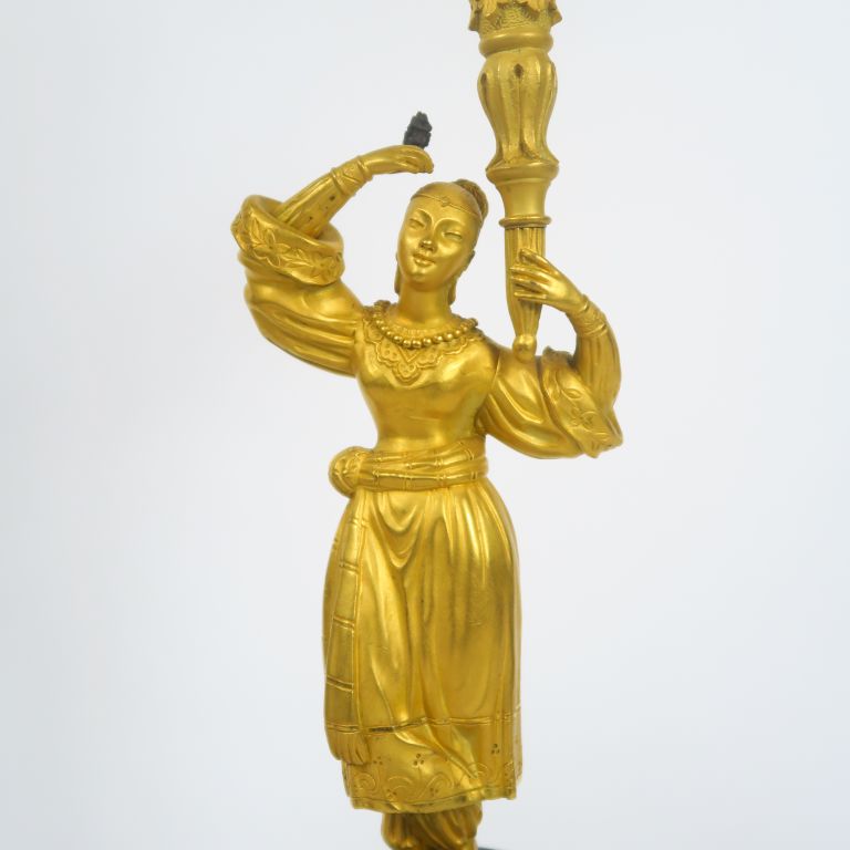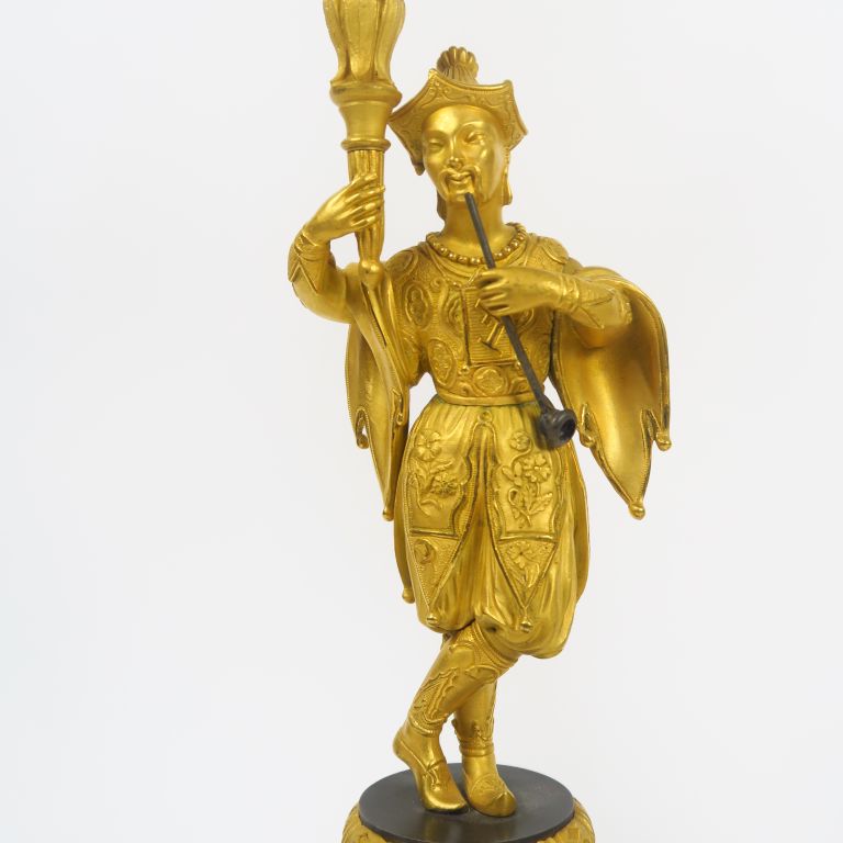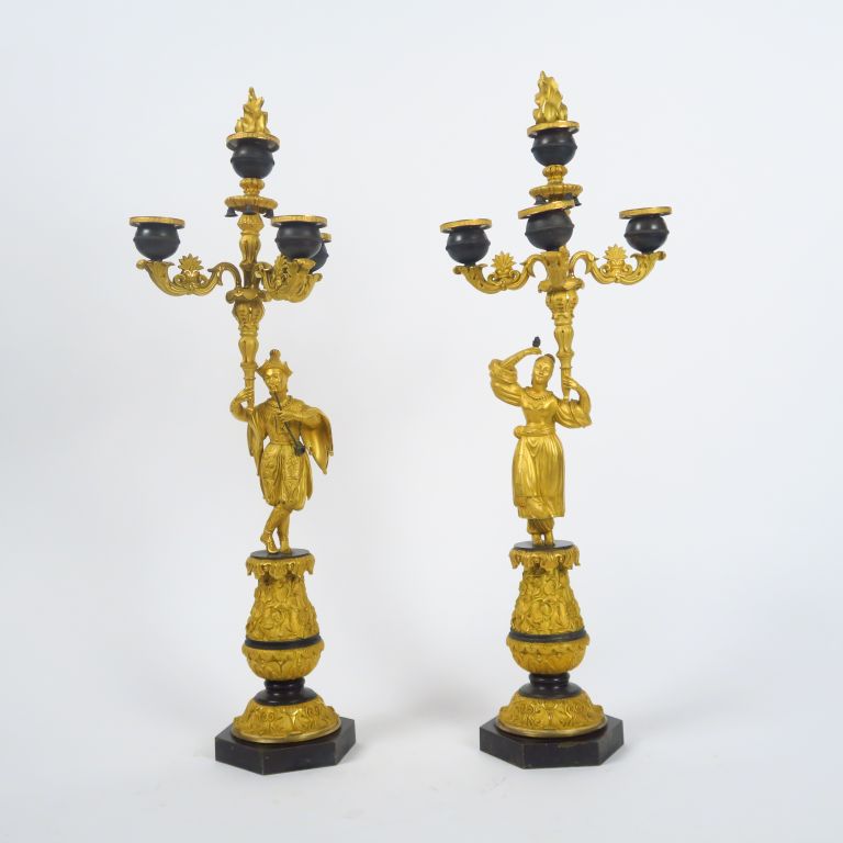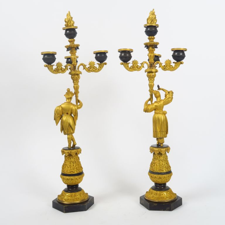 Paire de candélabres Restauration "aux chinois" en bronze bicolore à patine brune et dorée, éclairant à cinq lumières. H. 55 cm
