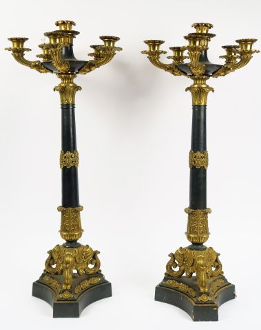Paire de candélabres Restauration en bronze doré et tôle à patine verte, éclairant à 5 lumières, piètement tripode feuillagé. H. : 69 cm