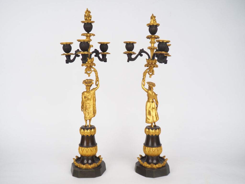 Paire de candélabres Restauration en bronze patiné vert et doré, à décor de personnages emplumés sur un balustre, éclairant à quatre lumières. H. 58 cm (petit manque)
