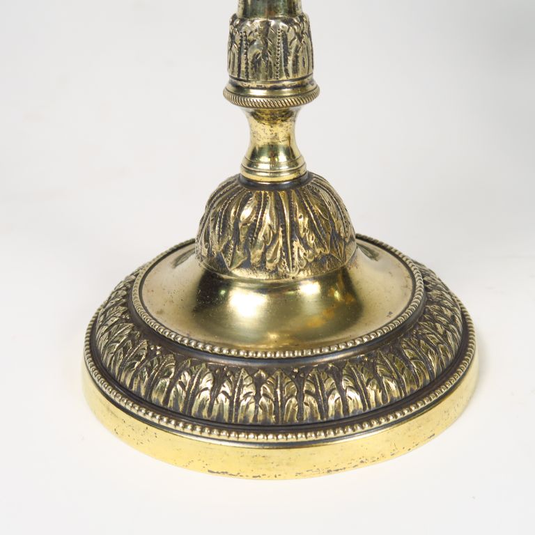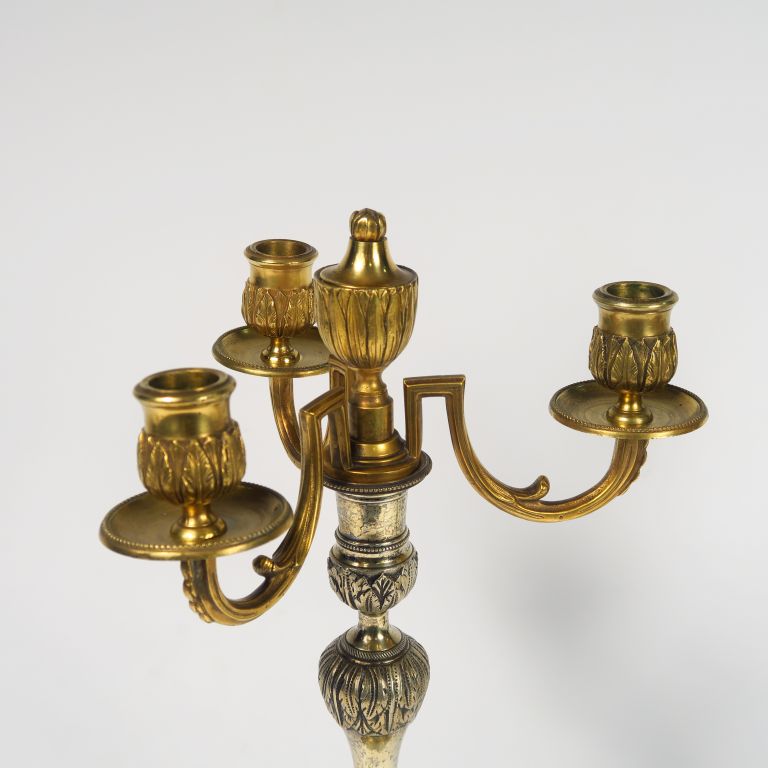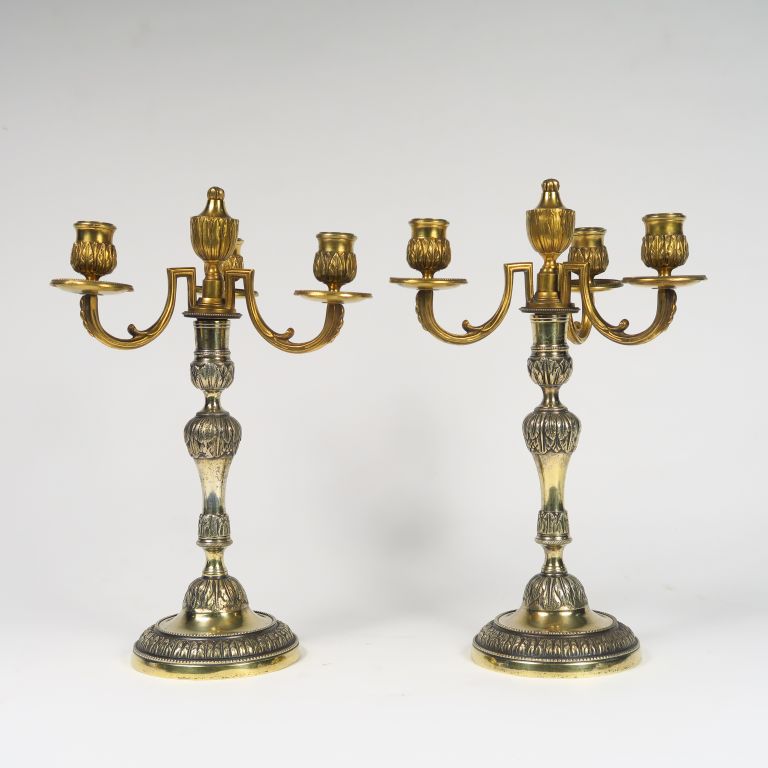 Paire de candélabres XIXème de style Louis XVI en bronze à décor de feuilles d'eau, éclairant à trois lumières. H. : 39 cm.