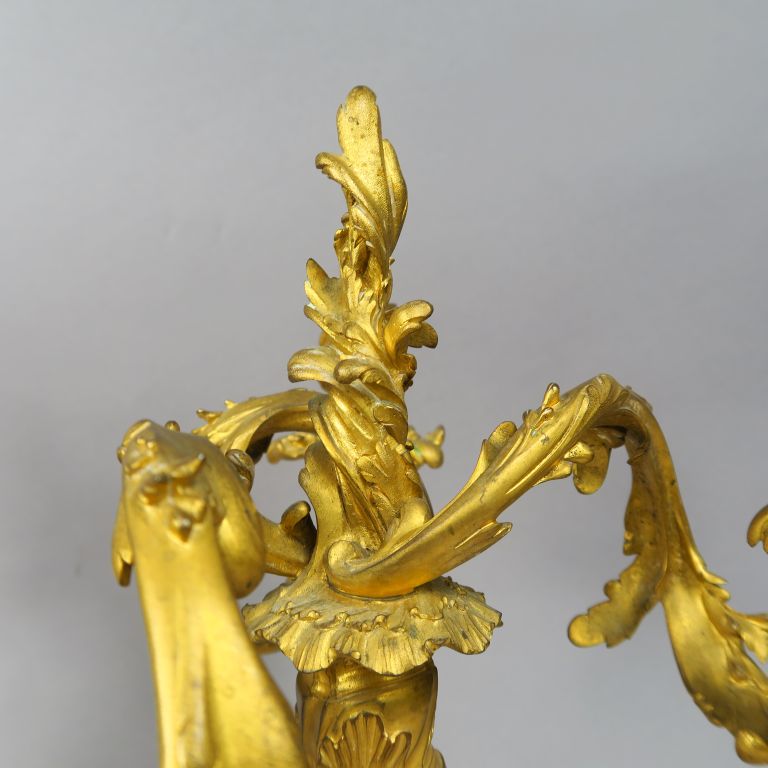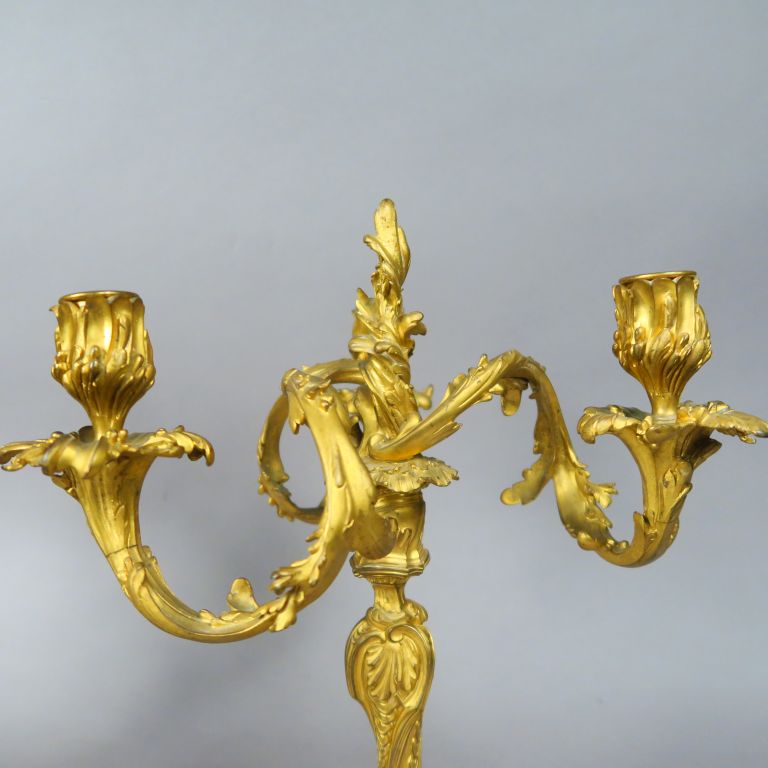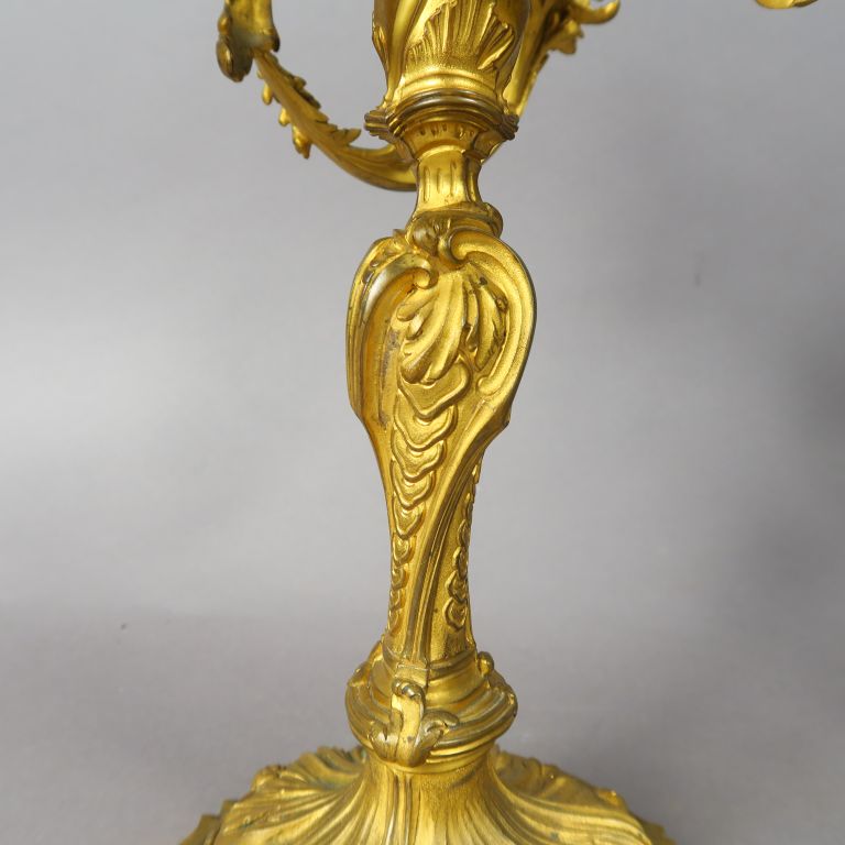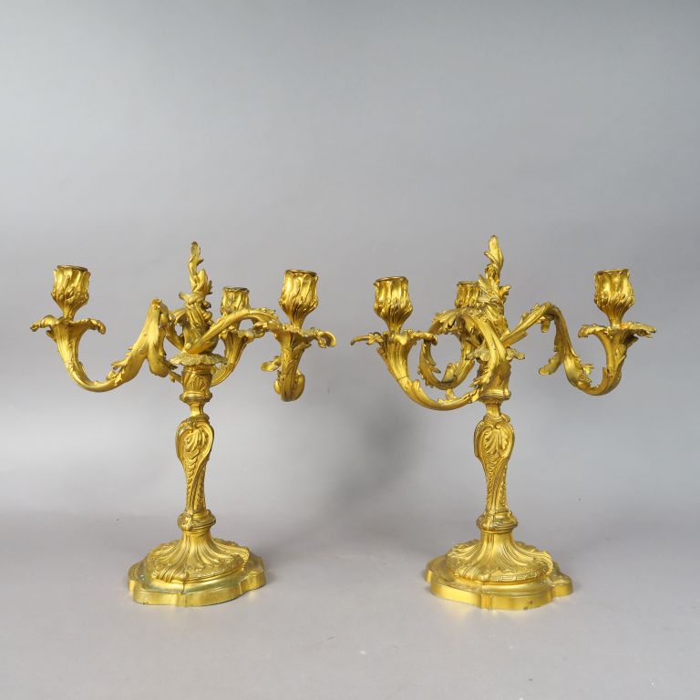Paire de candélabres XIXème en bronze doré de style rocaille, éclairant à trois lumières. H. : 37 cm.