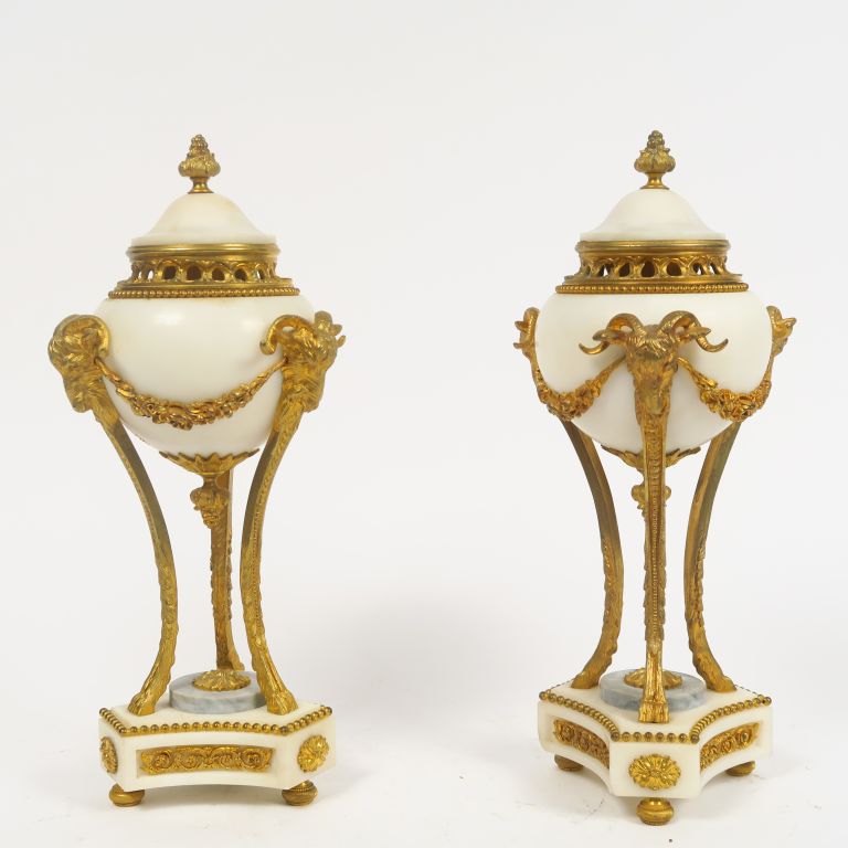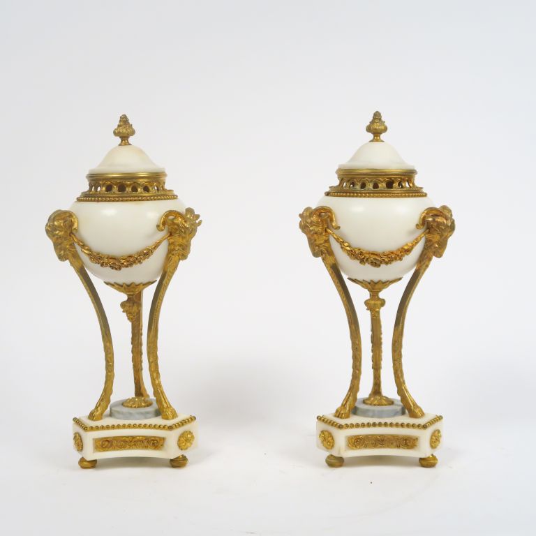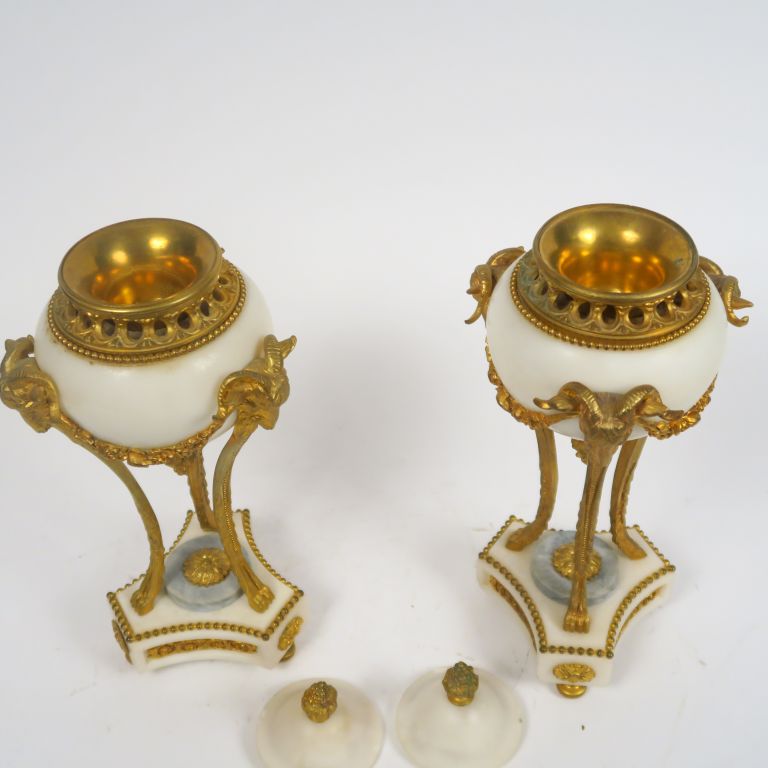 Paire de cassolettes Empire en marbre et bronze doré à décor de têtes de béliers et de guirlandes de fleurs. H. 34 cm (Micro égrenures)