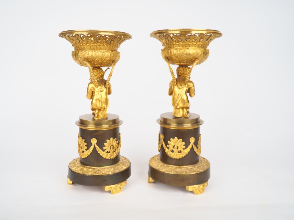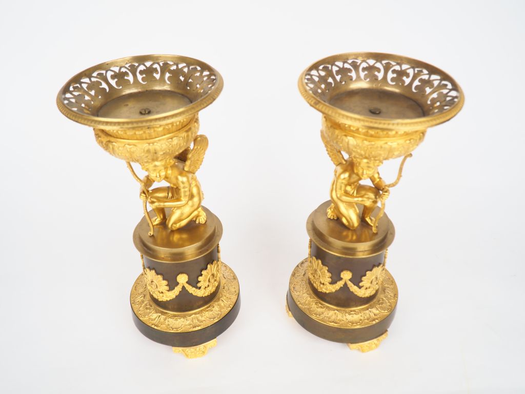 Paire de cassolettes XIXème en bronze à double patine, à décor d’amour agenouillé sur une demie colonne tronquée et supportant une corbeille ajourée. H : 35,5 cm