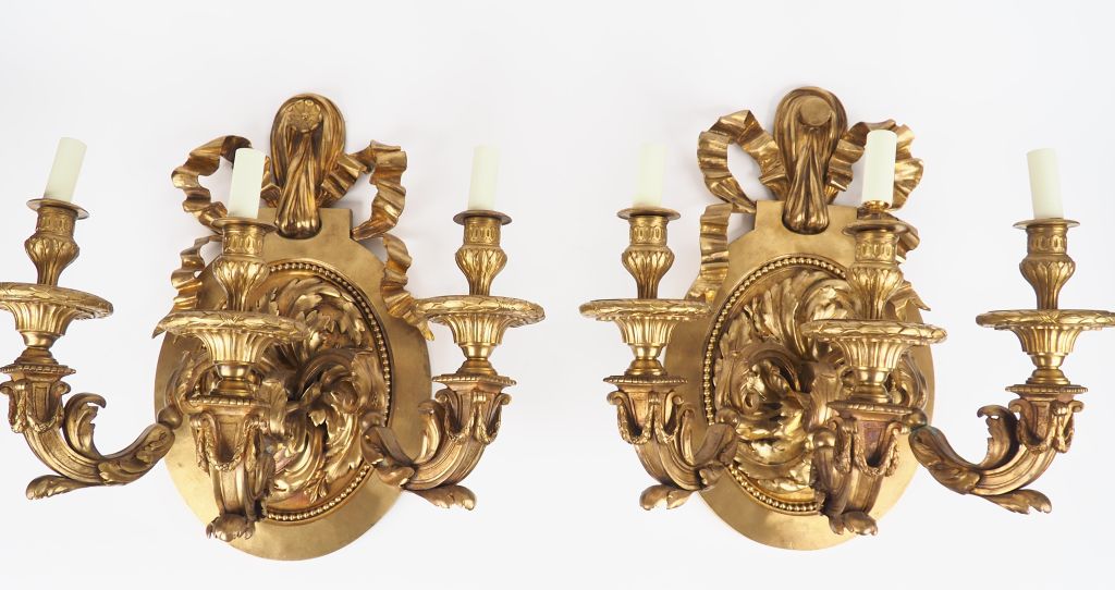 Paire de grandes appliques de style Louis XVI en bronze, à décor de nœuds de ruban, de feuille d'acanthe et de guirlande, éclairant à trois lumières. Dim. 53 x 54 cm