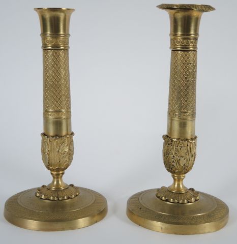 Paire de grands bougeoirs de style Empire en bronze ciselé et doré à décor de cannelures, de feuilles d’acanthe et de palmettes. H. 20 cm (manque une bobèche)