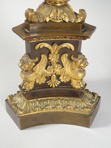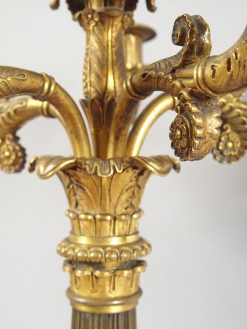 Paire de grands candélabres Restauration en bronze, à décor de griffons, de feuilles d'acanthe et de feuillage, éclairant à 5 lumières. H. : 64,5 cm