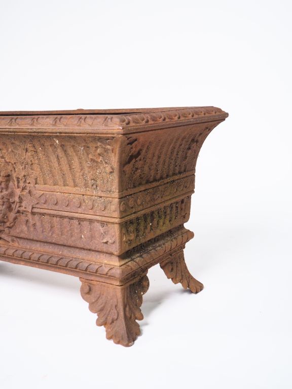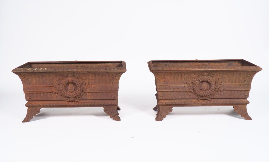 Lot de Paire de jardinières rectangulaires en fonte. Dim.38 x 72 x 36,5 cm au prix de 200 à 300 € en vente aux enchères par l'hôtel des ventes Primardeco