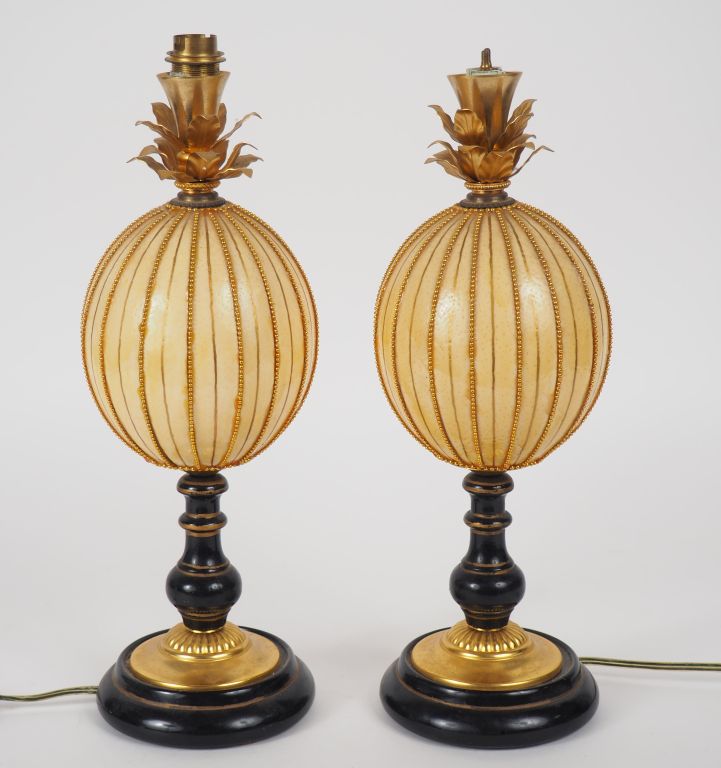 Paire de lampes "ananas" en œuf d'autruche monté en métal doré et bois noirci. H. 36 cm