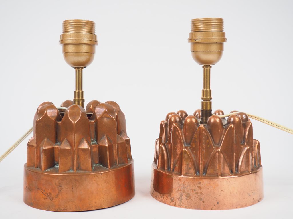 Lot de Paire de moules à kouglof en cuivre montés en lampe. H. : 21 cm. au prix de 40 à 60 € en vente aux enchères par l'hôtel des ventes Primardeco