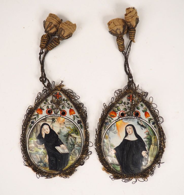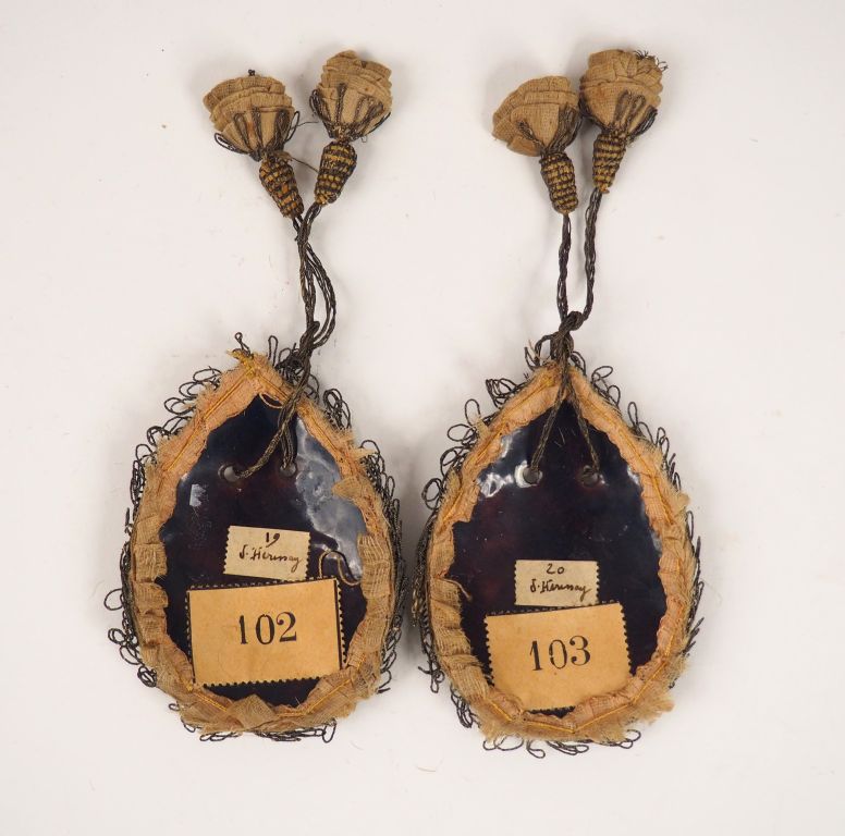 Paire de plaques de bourse en émail peint polychrome représentant sainte Scholastique et saint Benoît , montures de passementerie. Contres-émaux violacés , anciennes étiquettes au dos. Limoges, ateliers des derniers Nouailher, début du XVIIIème siècle. Hauteur : 9 cm – Largeur : 6 cm Provenance : ancienne collection Jacques Hérissay, n°19 et 20 Expert : Laurence Fligny