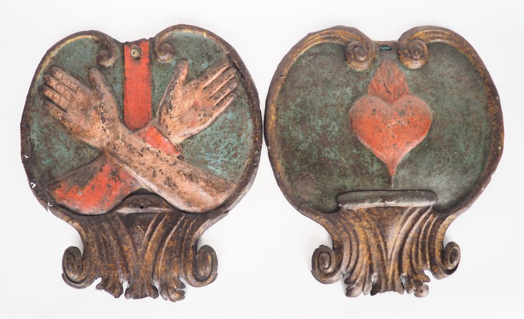Paire de plaques XVIIIème en tôle polychrome repoussée, l'une à décor de sacré cœur enflammé, l'autre à décor des stigmates sur les mains du Christ Dim. 48 x 43 cm.