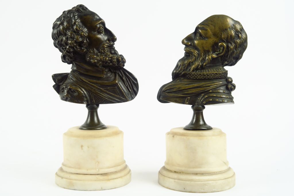 Paire de sujets de style Louis XIII en bronze et marbre blanc, "Profils d’Henri IV et de Sully". H. avec les socles : 26,5 cm