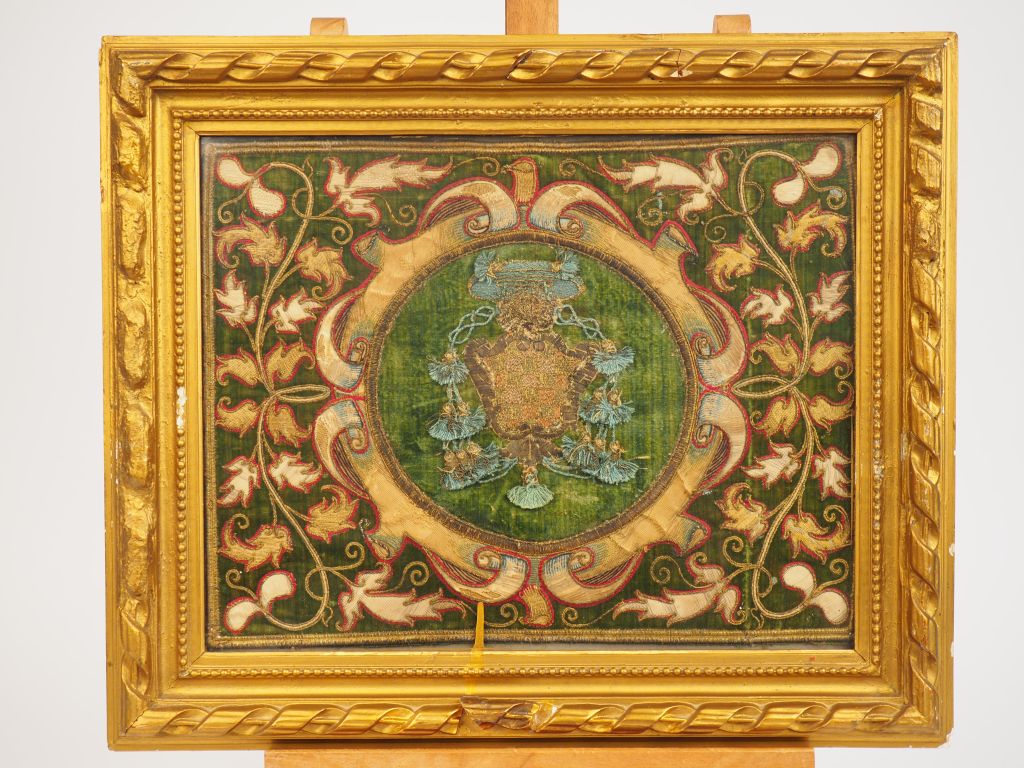 Paire de tissus brodés XVIIIème, à décor d’armoiries en médaillon. Dim. à vue : 29.5 x 38 cm
