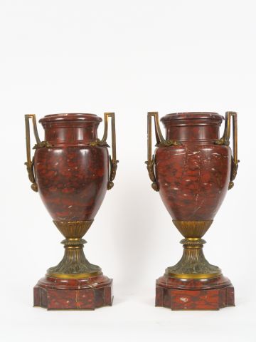 Paire de vases à anses Napoléon III de style Louis XVI en marbre rouge et bronze H. 40 cm