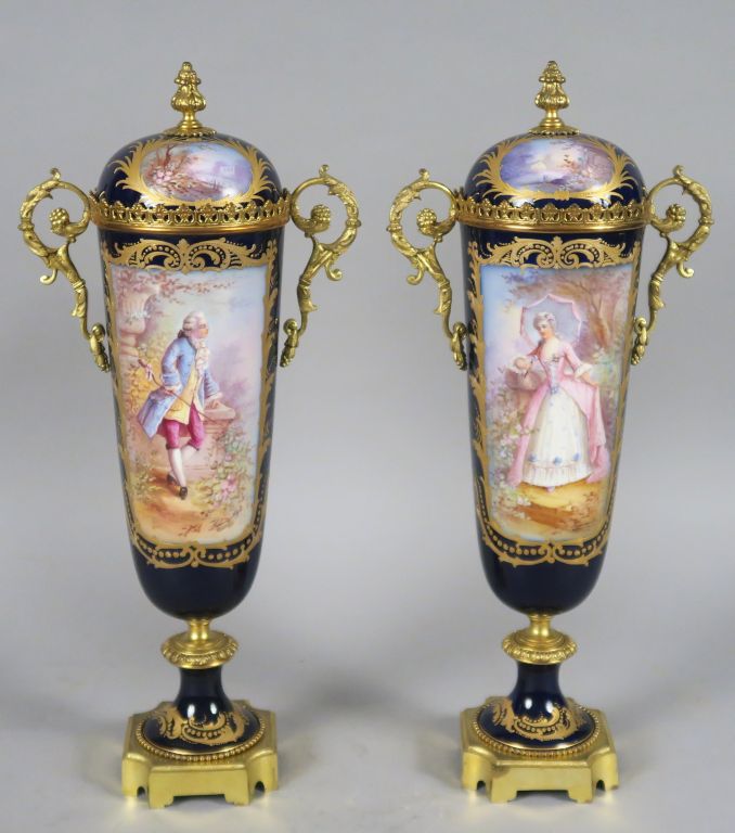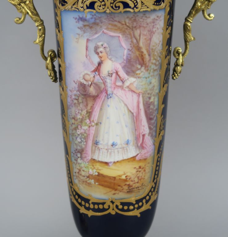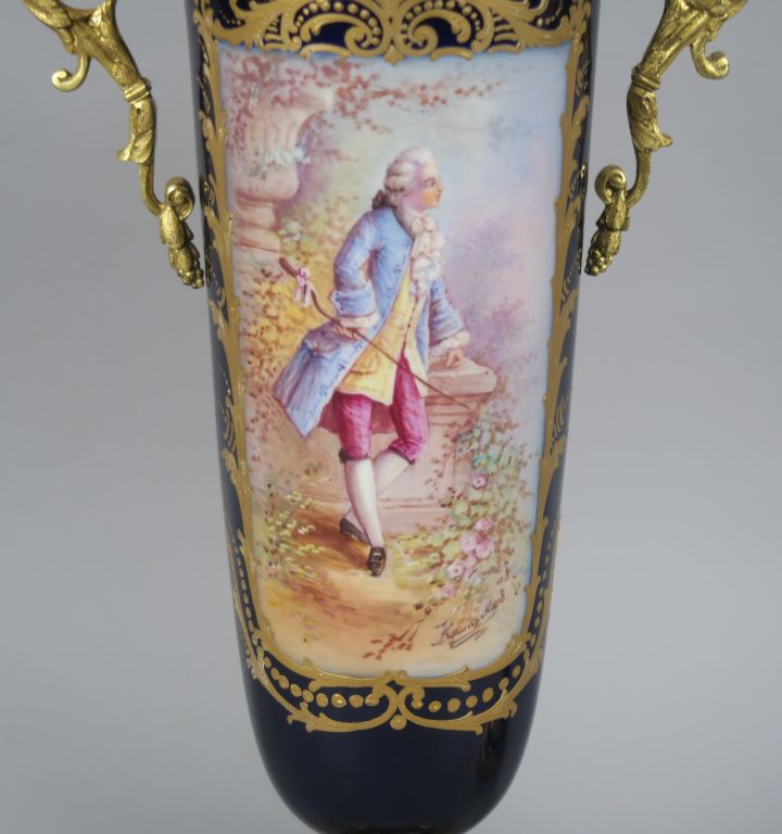 Paire de vases couverts en porcelaine de Sèvres, à décor polychrome d'élégants, sur fond bleur de four rehaussé d'or. Monture en métal doré. H. 46 cm