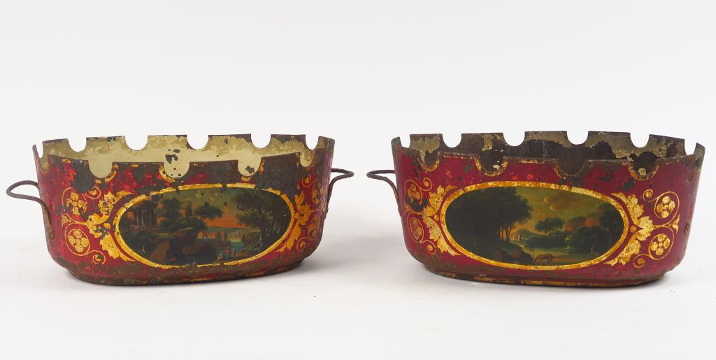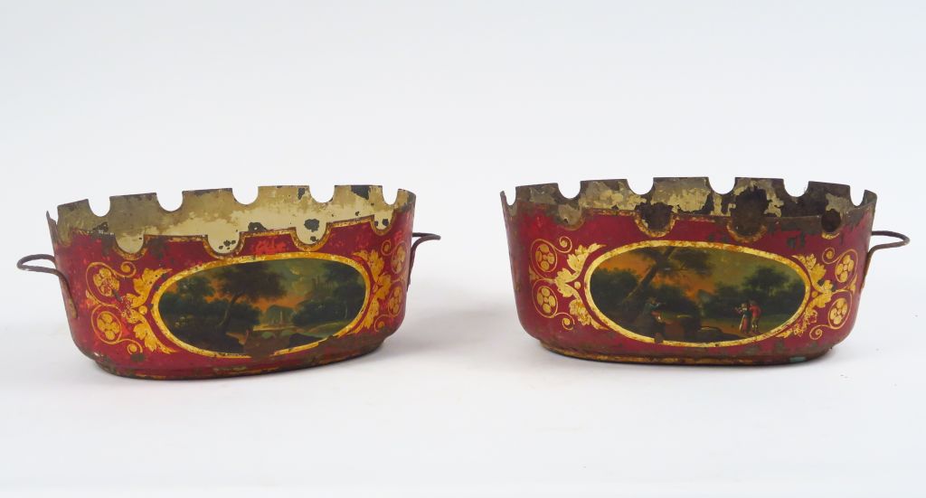 Paire de verrières Directoire en tôle peinte, à décor dans des réserves de paysages lacustres animés sur fond rouge rehaussé d'or. H. 11,5 cm (sauts de peinture)