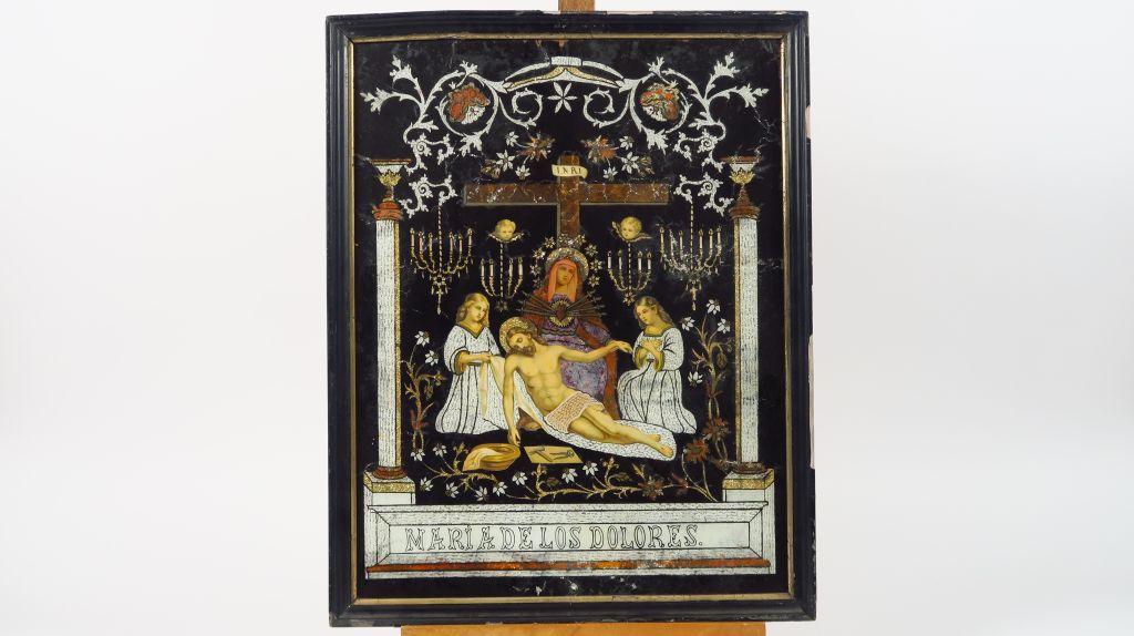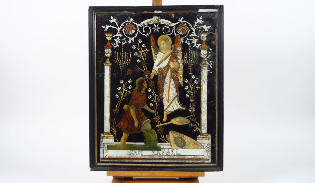 Paire d’encadrements religieux «Maria de los dolores » et « San Rafael » Gravures polychromes et verre églomisé. 49.50 x 39 cm (petits accidents)