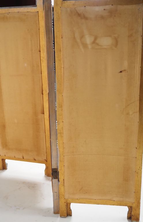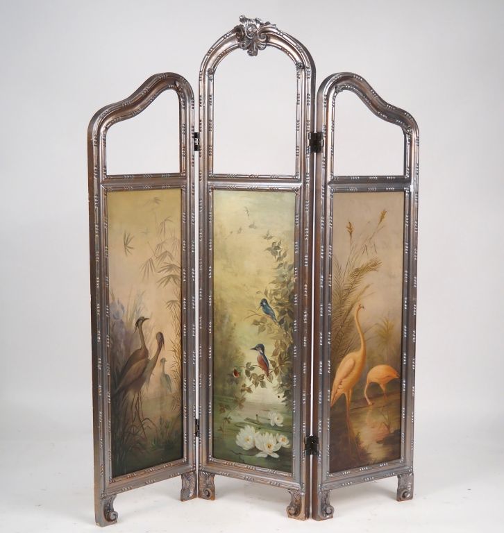 Paravent 1900 à trois brins, toiles peintes à décor d'oiseaux , montants en bois laqué argent. Dim. 156 x 124 cm (troué)