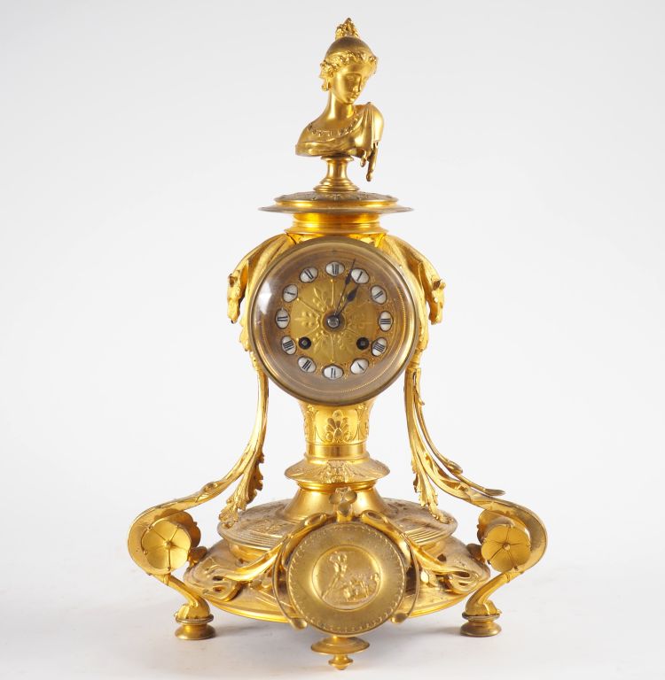 Pendule de cheminée Napoléon III en métal doré et bronze à décor de femme à l'antique en buste et de scène mythologique dans une réserve. Chiffres du cadran émaillés. H. 43,5 cm.