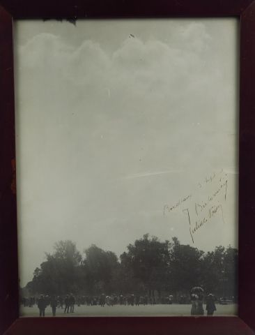 Photographie de Gabriel Voisin survolant Bordeaux le 3 septembre 1910. Située datée et signée par le pilote la photographie comporte une deuxième signature de Bielovucic.