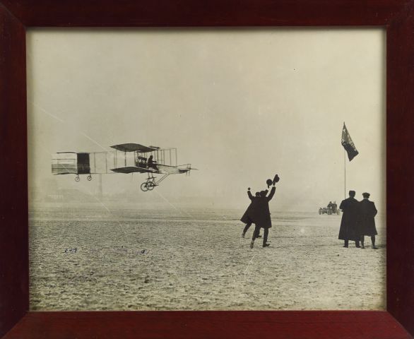Photographie d'henri Farman à l'attérissage, signée en bas à gauche. 21,5 x 27,5 cm