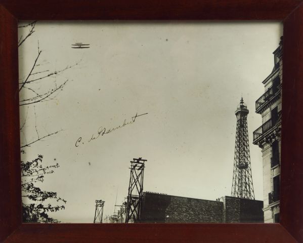 Photographie du Comte de Lambert survolant Paris sur son biplan Wright le 18 octobre 1909. Signée par le pilote à gauche. 22 x 27,5 cm
