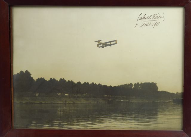 Photographie d'un biplan Voisin en vol. Signée par Gabriel Voisin en haut à droite et datée Août 1911. 27 x 38 cm
