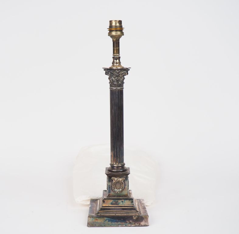 Pied de lampe en métal argenté en forme de colonne corinthienne.