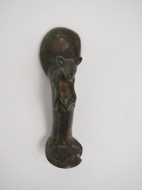 Pied en bronze décoré d’un animal (loup). Période étrusque ou préromaine. H. : 10 cm.