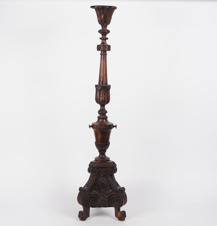 Pique-cierge XIXème en bois mouluré et sculpté à décor de palmes, de fleurettes et de trophées, pieds griffes. H. 100 cm. (Manques).