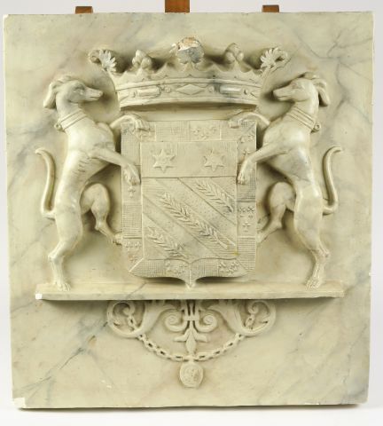Lot de Plaque d'armoiries en stuc (petites égrenures). 50 x 46 cm au prix de 100 à 200 € en vente aux enchères par l'hôtel des ventes Primardeco