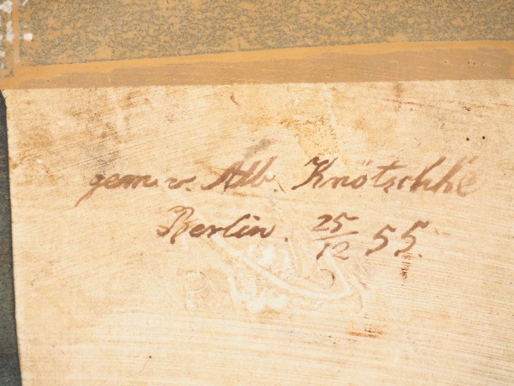 Plaque début XIXème en porcelaine polychrome allemande représentant un enfant allongé sur un oreiller et sur un drapé bleu. Dim à vue. 13 x 15,5 cm.