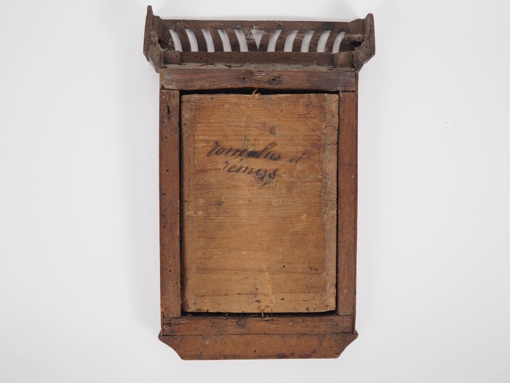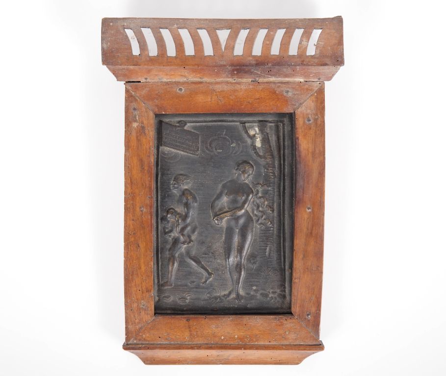Plaque en bronze XVIIIème (?) "Histoire de Romulus et Rémus" Dans un cadre italien en noyer Dim plaque. 20,5 x 15 cm