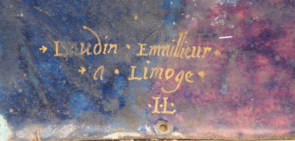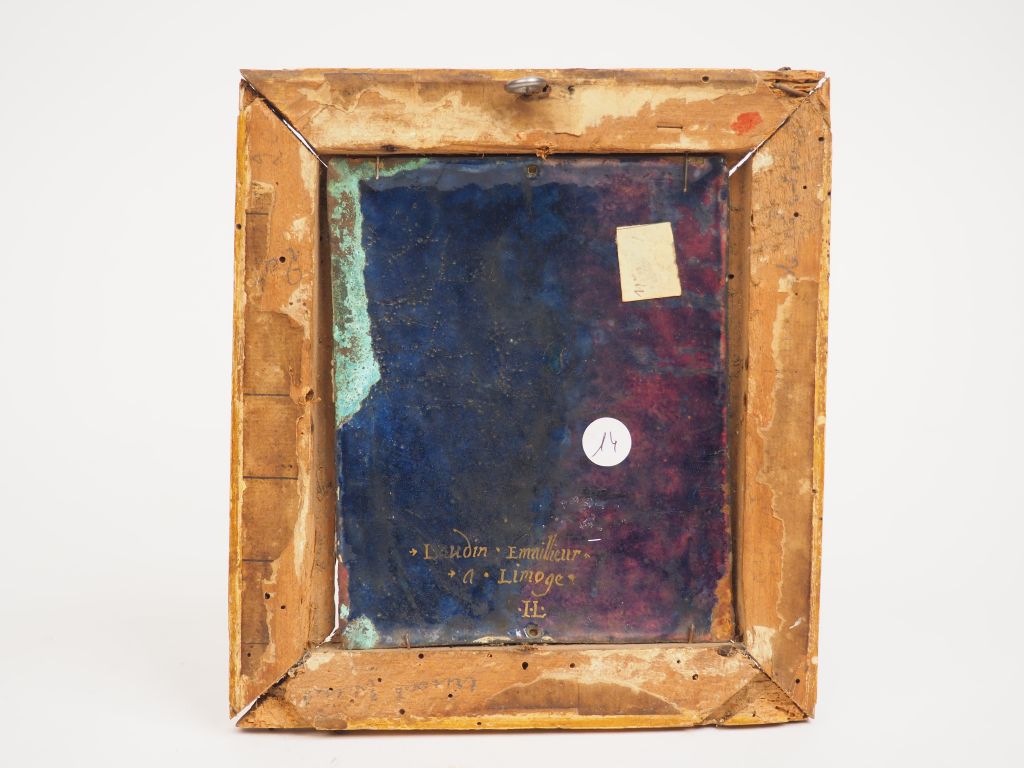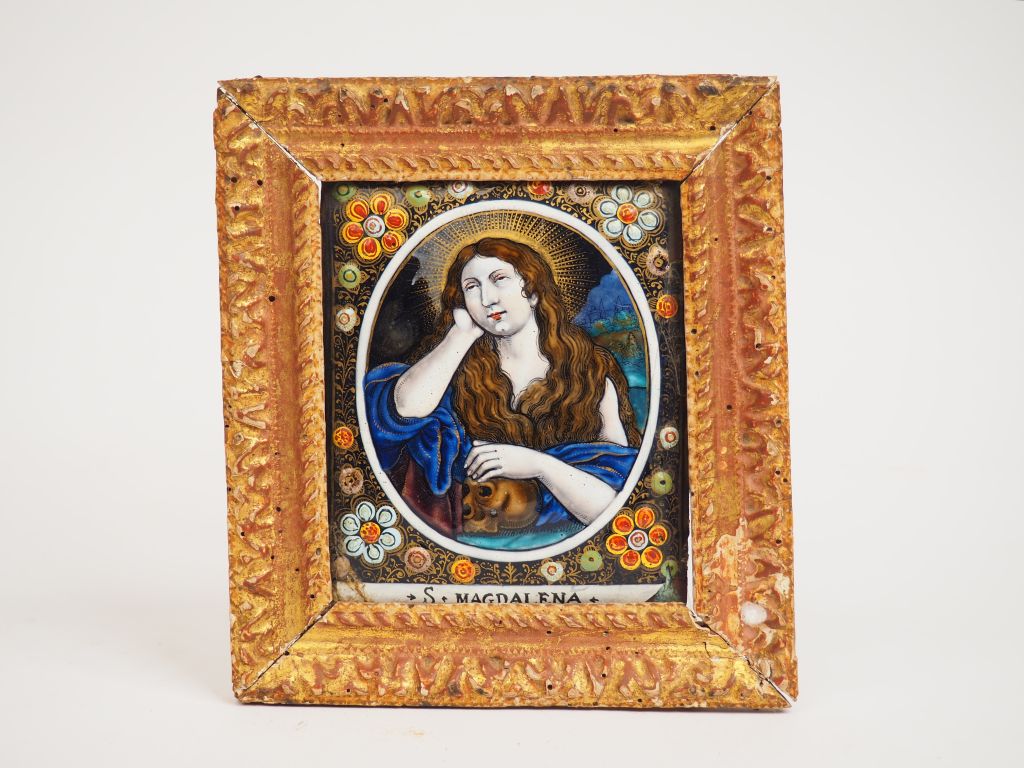 Plaque en émail peint polychrome avec rehauts de d’or représentant dans un médaillon ovale sainte Marie-Madeleine. Inscription S* MAGDALENA . Contre-émail violacé avec signature Laudin . Emaillieur . a . Limoge . I.L. Limoges, atelier de Jacques II Laudin, seconde moitié du XVIIème siècle. Hauteur : 13 cm – Largeur : 10,5 cm Dans un cadre ancien en bois sculpté et doré du XVIIIe (petits accidents) Expert : Laurence Fligny
