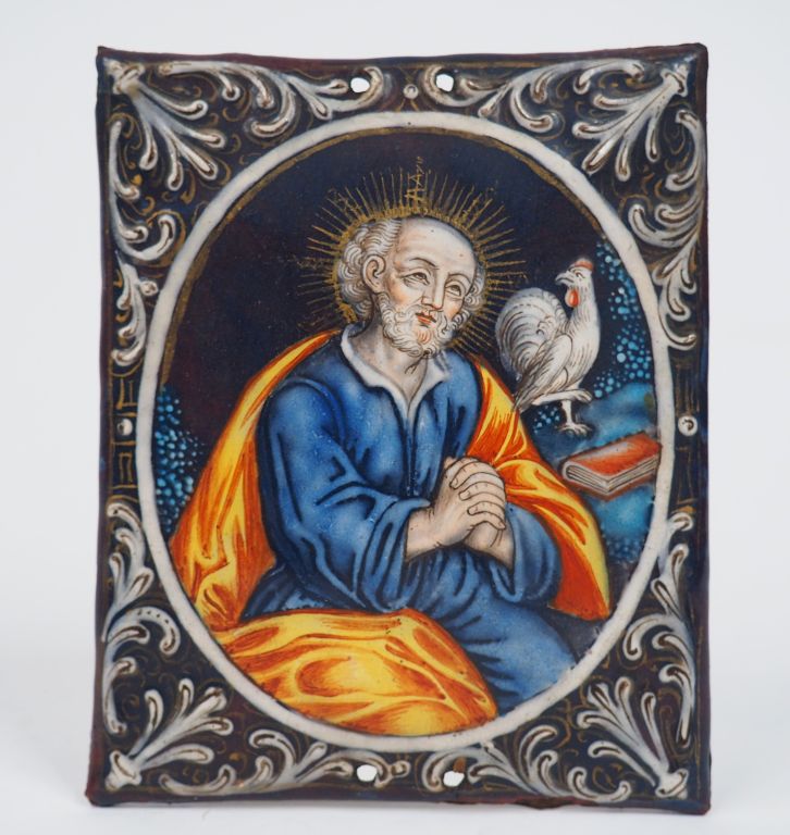 Plaque en émail peint polychrome représentant le Repentir de saint Pierre dans un encadrement de rinceaux feuillagés. Contre-émail violacé. Limoges, fin du XVIIème - première moitié du XVIIIème siècle. Hauteur : 10 cm – Largeur : 8 cm (très légers accidents) Expert : Laurence Fligny