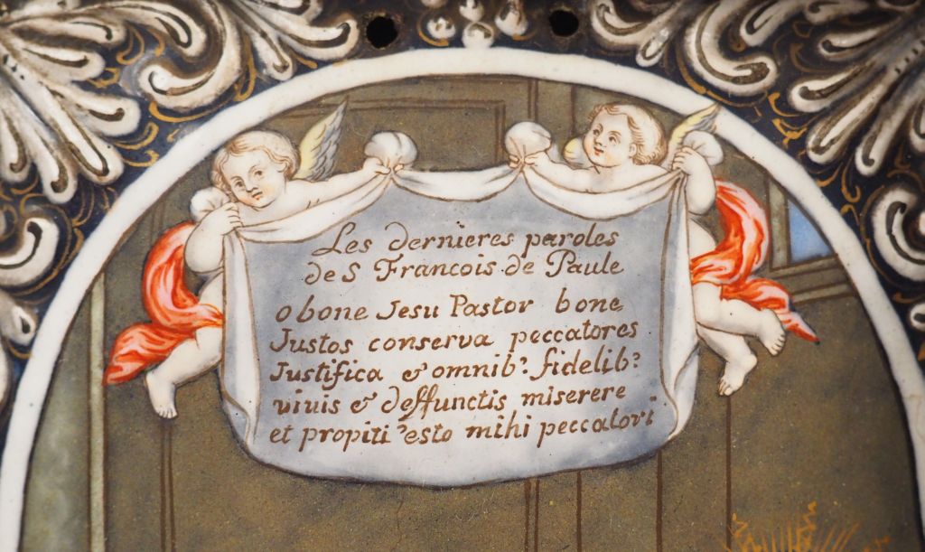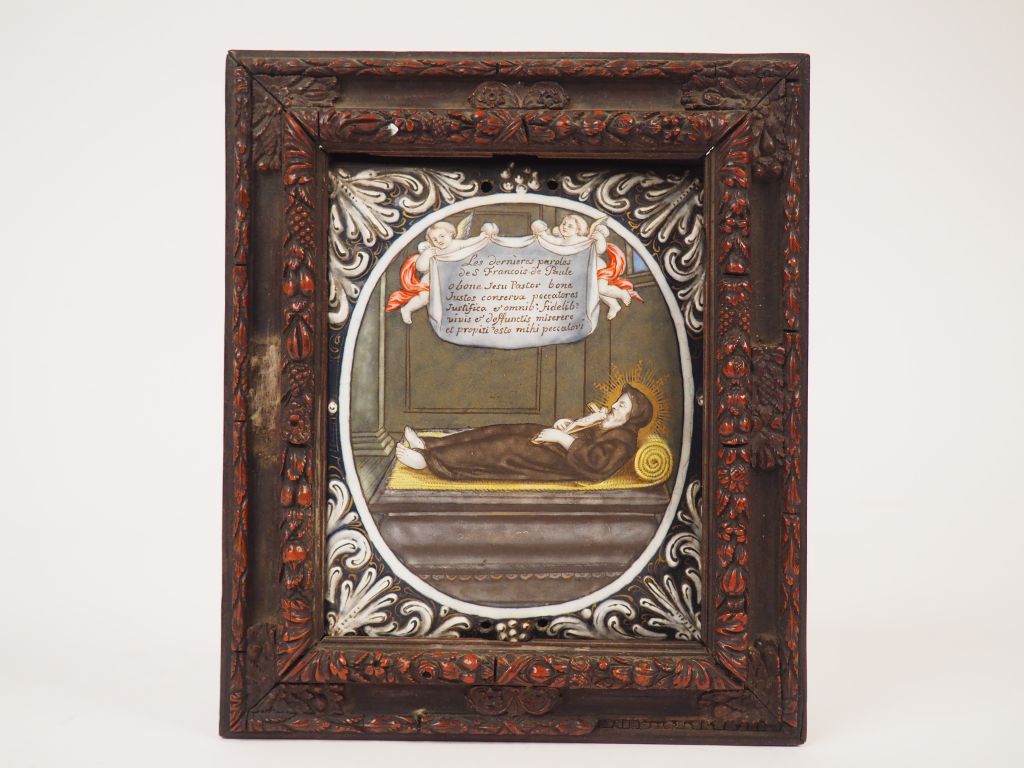 Plaque en émail peint polychrome représentant Saint François de Paul en gisant. Inscription sur une draperie tenue par deux anges Les dernières paroles de S François de Paule o bone Jesu Pastor bone Justos conserva peccatores Justifica et omnib’ fidelib’vivis et deffunctis miserere et propiti’ esto mihi peccatori . Limoges, fin du XVIIème - premier tiers du XVIIIème siècle. Hauteur : 11,5 cm – Largeur : 9 cm Dans un cadre d’époque Louis XIV en bois sculpté dans le goût de Bagard. Expert : Laurence Fligny