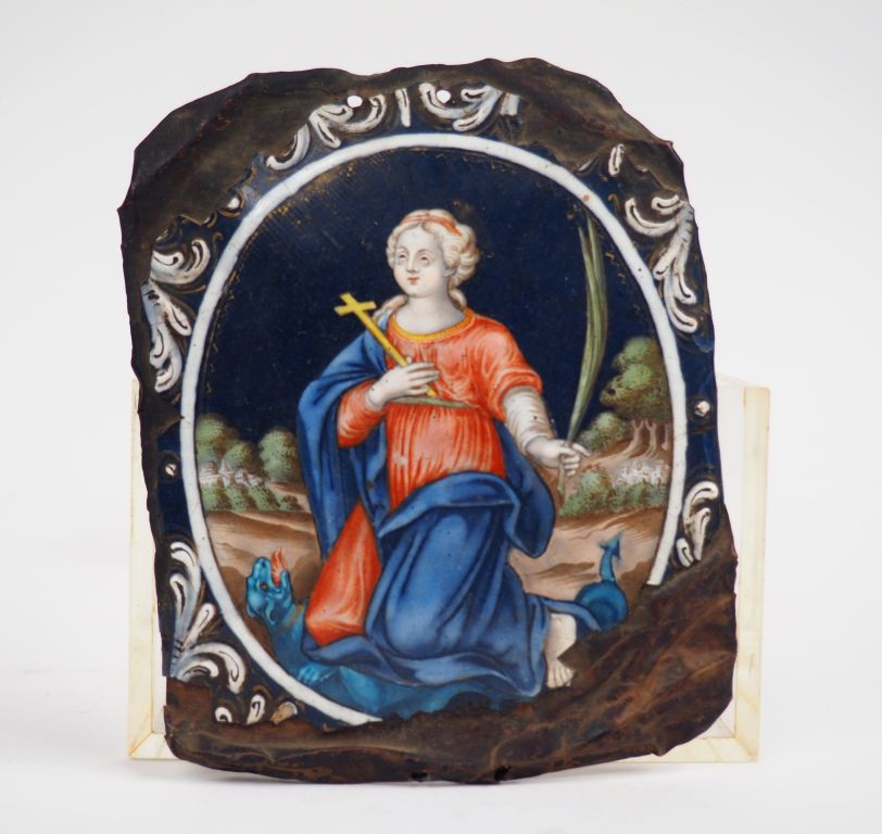 Plaque en émail peint polychrome représentant sainte Marguerite. Contre-émail bleu. Limoges, fin du XVIIème - premier tiers du XVIIIème siècle. Hauteur : 13 cm – Largeur : 10 cm (accidents et manques) Expert : Laurence Fligny