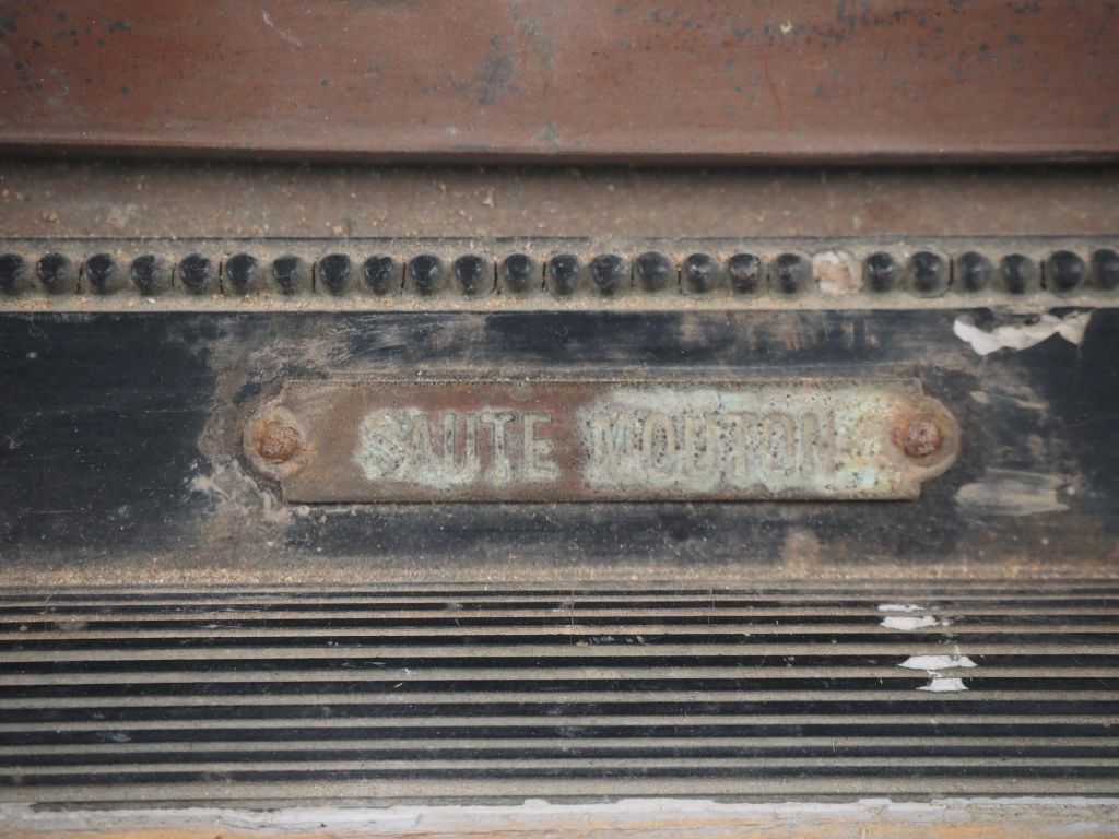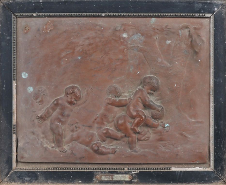 Plaque Napoléon III en régule à patine brune, "saute-mouton". Dim. 21 x 27 cm.