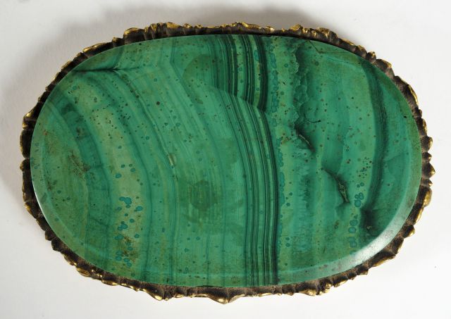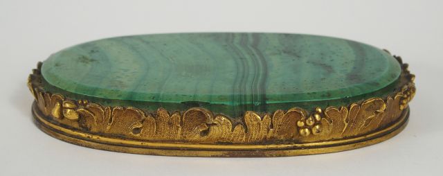 Plaque ovale XIXème, presse-papier, en malachite, monture en bronze doré, à décor de feuillage et de fruits. Dim. : 9,5 x 14 cm