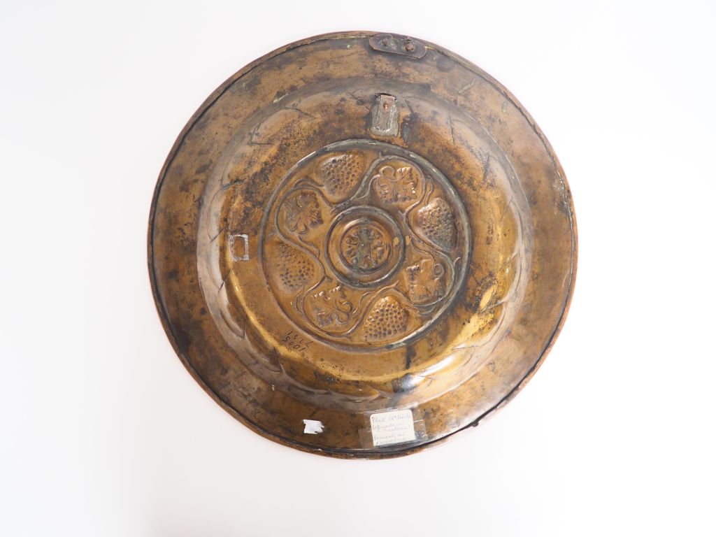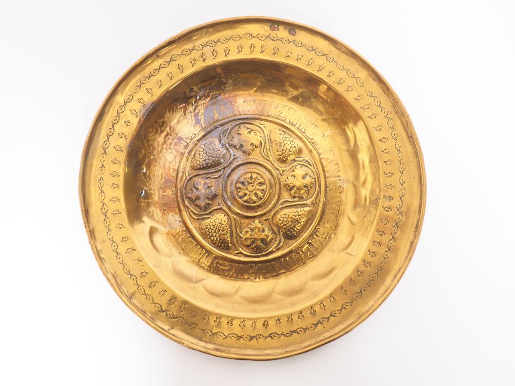 Lot de Plat à offrandes XVIIème en dinanderie à décor de pampres. Dim. 5 x 38 au prix de 100 à 150 € en vente aux enchères par l'hôtel des ventes Primardeco