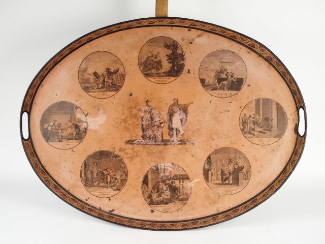 Plateau en tôle Directoire lithographié à décor dans des réserves de huit scènes mythologie romaine sur fond rose pale. 56 x 75 cm