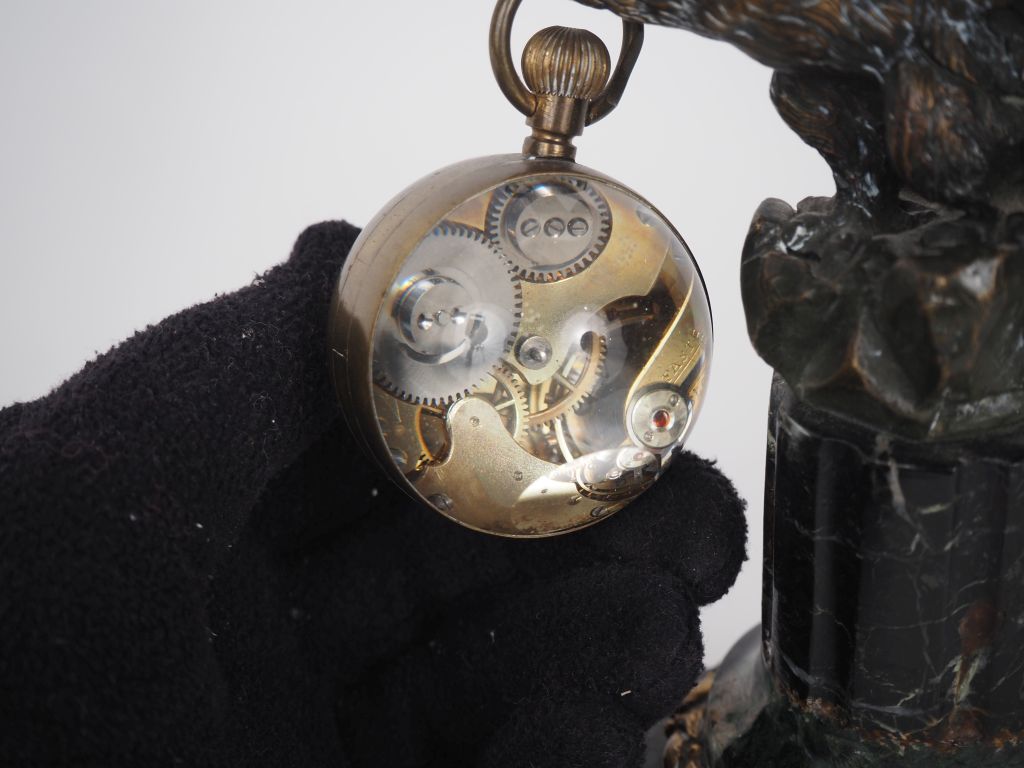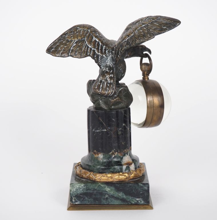 Porte montre en régule et marbre vert de mer figurant un aigle avec une montre loupe. H. 17 cm