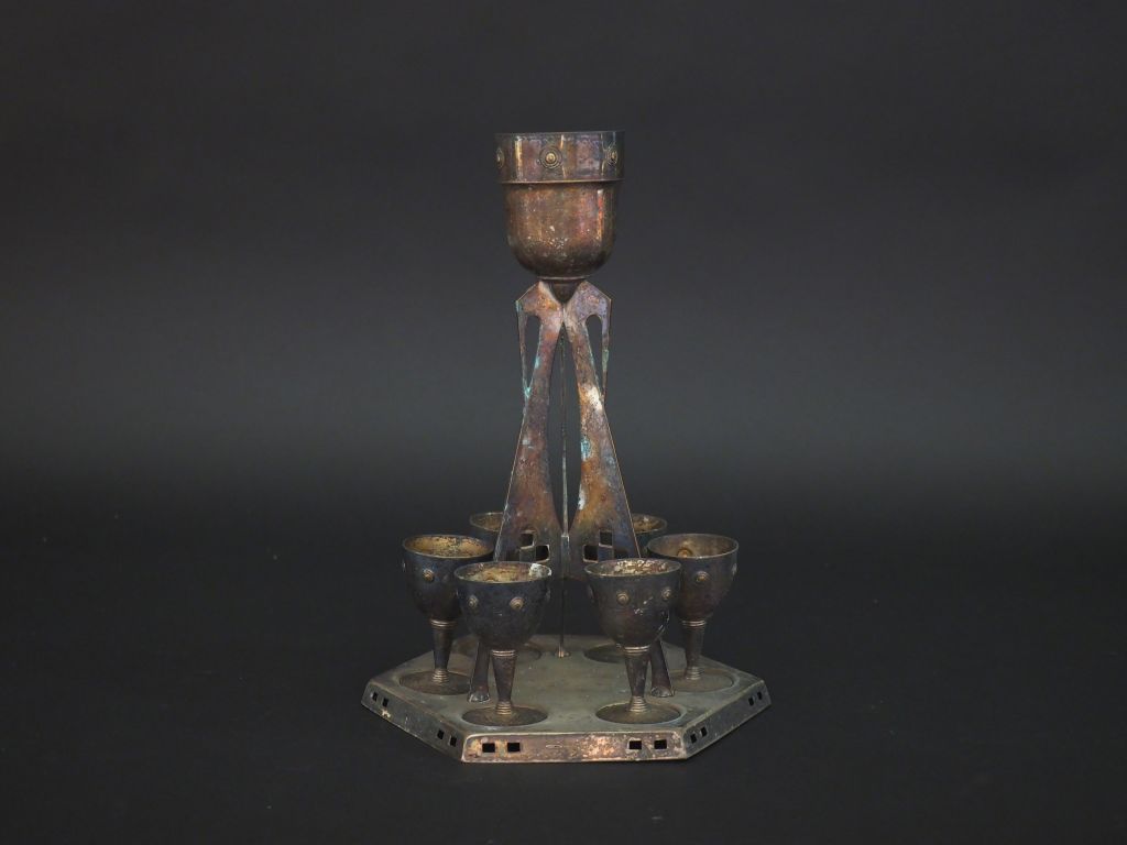 Présentoir à coquetiers et ses six coquetiers de style Art déco en métal argenté. H. 28 cm