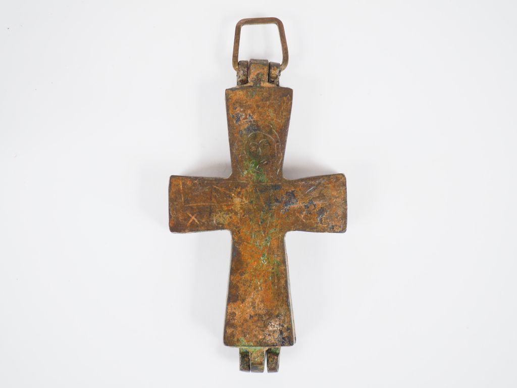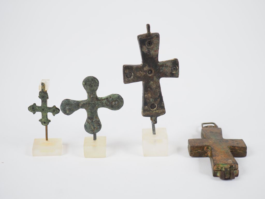 Quatre croix en bronze dont un reliquaire pectoral figurant d’un côté le Christ, de l’autre la mère de Dieu. Période byzantine ou postérieure. H. : 8 cm, 8 cm, 5 cm, 3.5 cm.