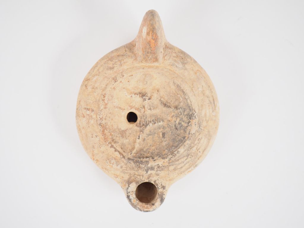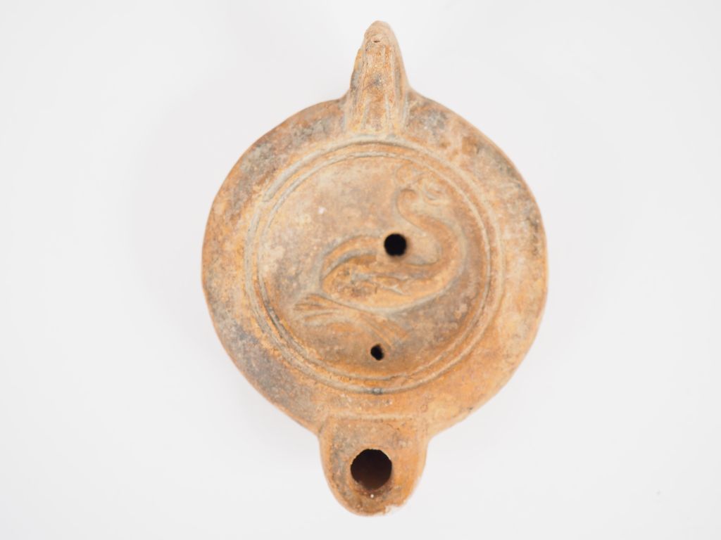 Quatre lampes romaine en terre cuite avec décor d’animaux (dauphin et caprin) et de personnages (Diane, Fortuna) en médaillon. II-IIIe s. apr. J.-C. L. : 12 cm, 10 cm, 10 cm et 10.5 cm.