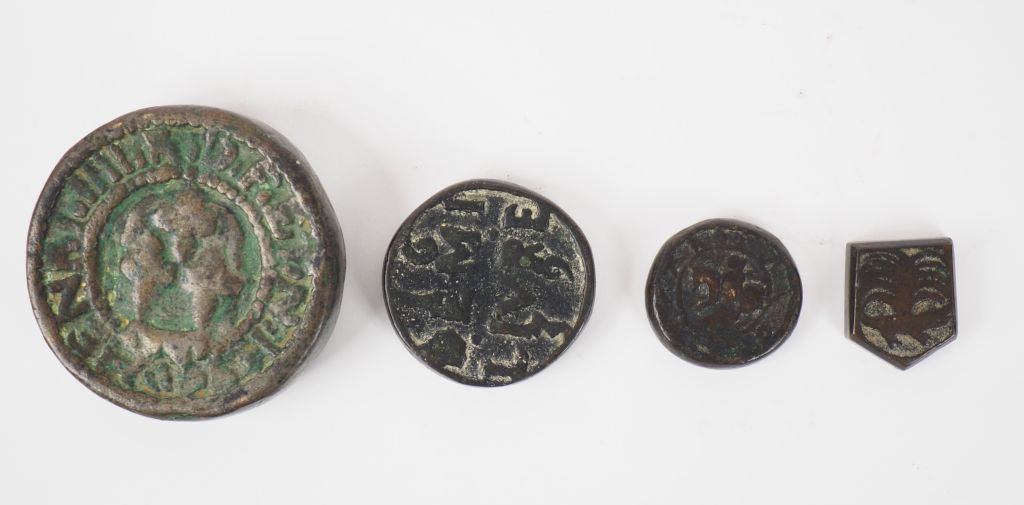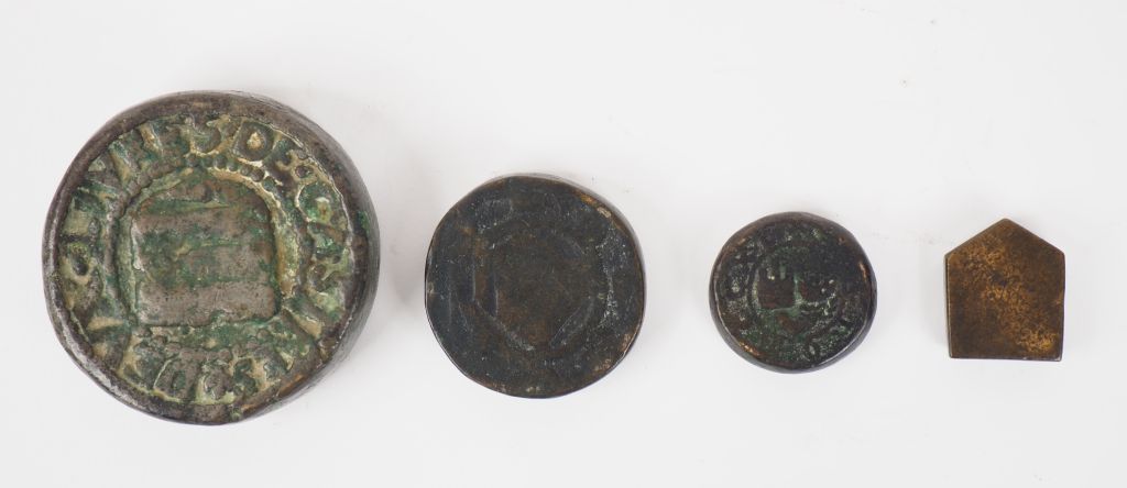 Quatre poids anciens (semi livres 1639, livres de Castres XVIIème, 2 autres également XVIIème).