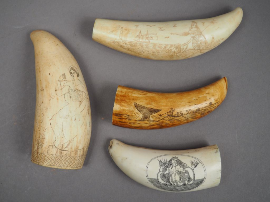 Quatre scrimshaws XIXème en ivoire marin gravé. Dim : 13 - 11,5 - 10 - 9 cm.
