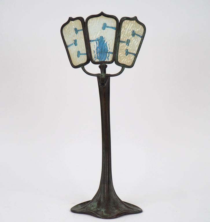 Réflecteur Art Nouveau en bronze à patine brune et verte et verre opalescent. H. 52 cm