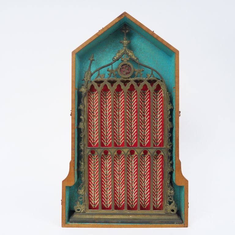 Reliquaire de style néo-gothique en métal, à décor d'arcatures. Dans son coffret en bois de sycomore. H. du reliquaire : 46 cm (manque)